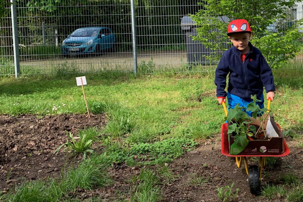 Gemeinsames Ackern ist ein echtes Abenteuer! Denn es gibt dabei jede Menge zu entdecken. Nicht nur Krabbelgetier wohnt in der Erde, sondern auch die nützlichen Regenwürmer. „Den müssen wir aber schnell wieder in die Erde setzen, denn der buddelt von Innen und macht die Erde locker. Dann können die Tomaten besser trinken“, sagt Noam und setzt den kleinen Wurm wieder ganz vorsichtig auf den Kita-Acker.